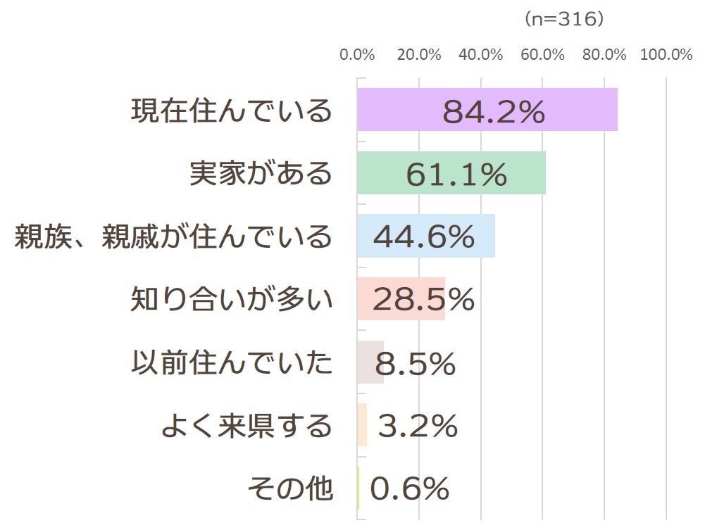 問1の「今の居住地域に住んでいる理由」では、「実家があるから」(53.2%)が最も高く、次いで「職場が近いから」(38.0%)でした。