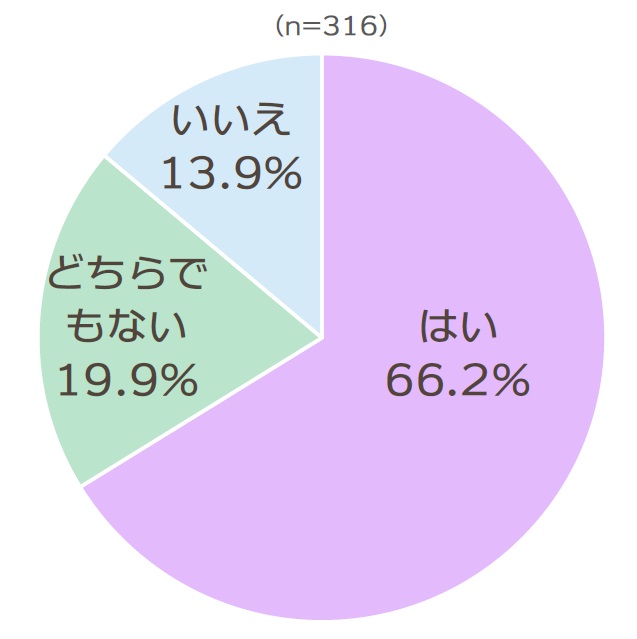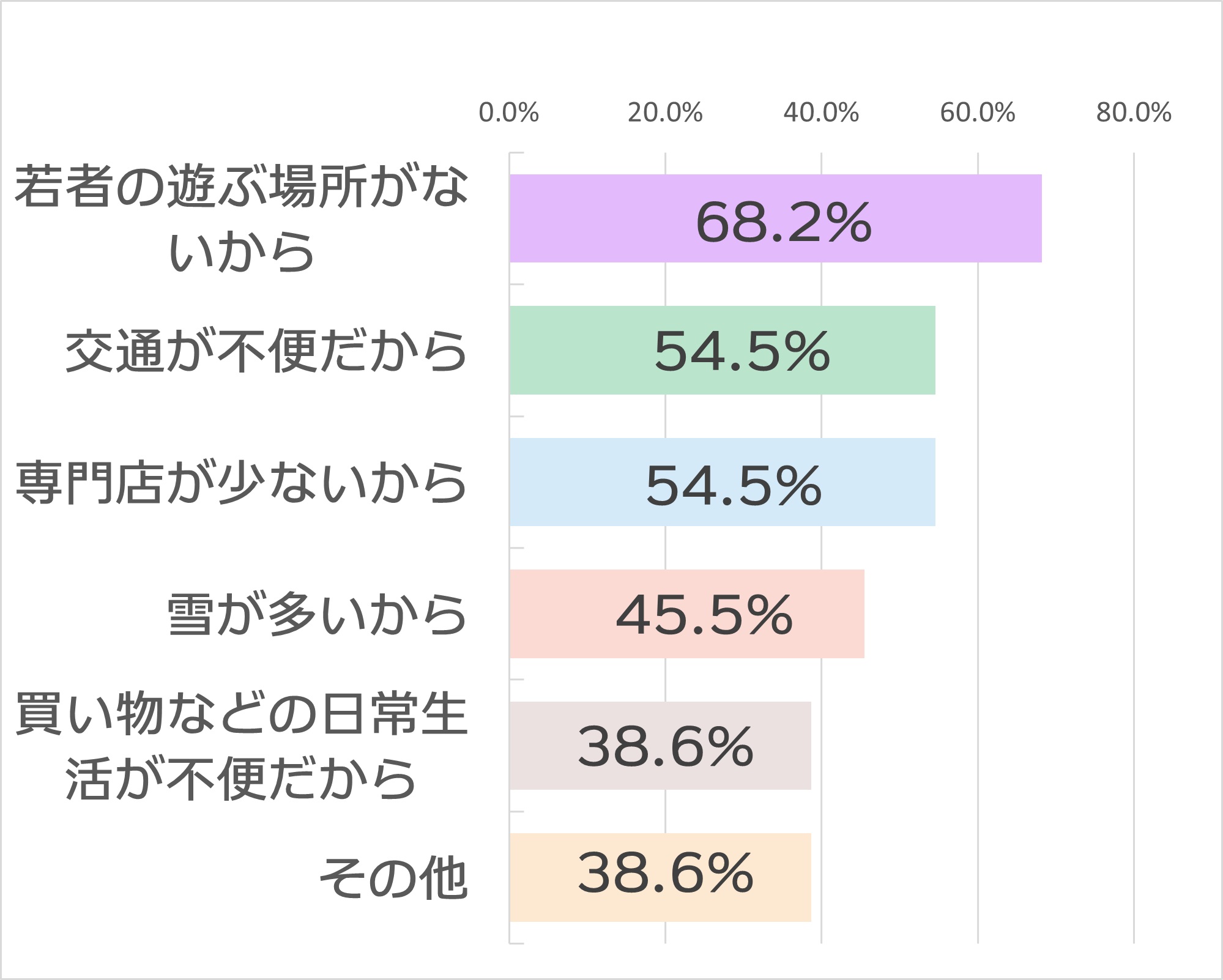問2の「今住んでいる地域は好きですか」という設問に対しては、「はい」(66.2%)が最も高く、理由は「食べ物がおいしいから」(65.1%)が高い結果となりました。「いいえ」と回答した人の理由では「若者の遊ぶ場所がないから」(68.2%)が最も高く、次いで「交通が不便だから」(54.5%)という結果となりました。