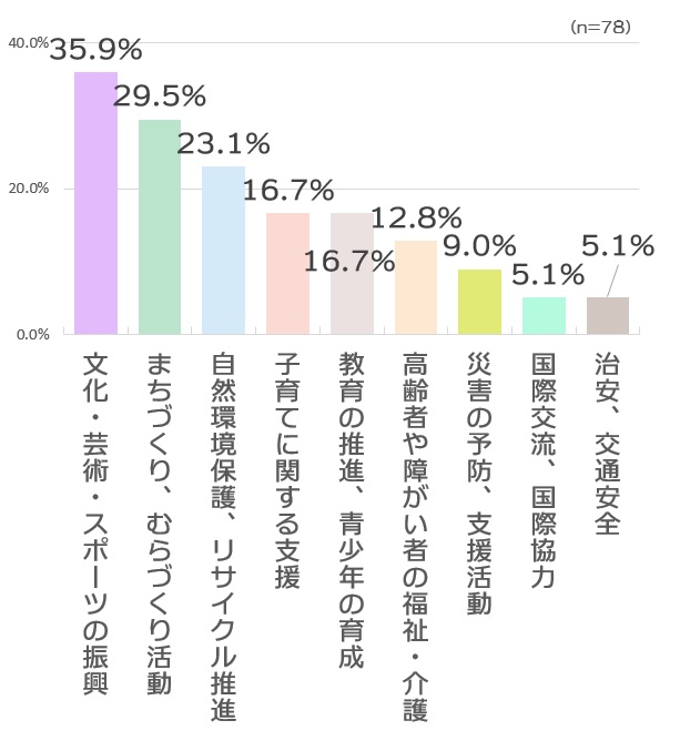 問8-1で、問8で「はい」と回答した人にどのような活動をしているかを尋ねたところ、「文化・芸術・スポーツの振興」(35.9%)が最も高く、次いで「まちづくり・むらづくり活動」(29.5%)となりました。