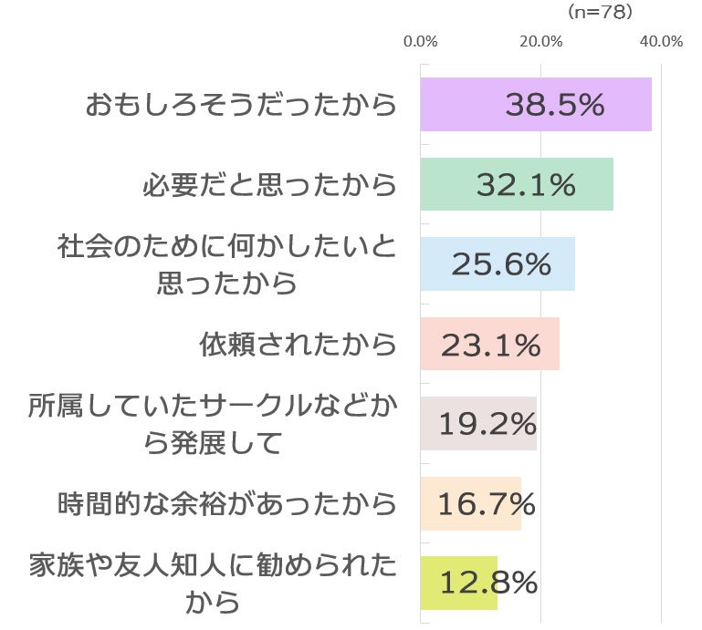 また、問8-2では、活動をすることになったきっかけを尋ねました。最も割合が高かったのは「おもしろそうだったから」(38.5%)、次いで「必要だと思ったから」(32.1%)となり、自発的に活動を始めていることがうかがえました。