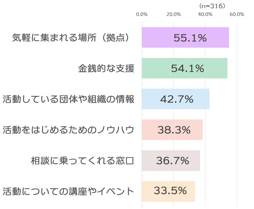 問9で「活動をしたい時にあったらよいと思うこと」を尋ねたところ、「気軽に集まれる場所(拠点)」(55.1%)が最も高く、次いで「金銭的な支援」(54.1%)となりました。その他の記述では「休暇」「人材の情報」など、興味深い回答がいくつも寄せられています。