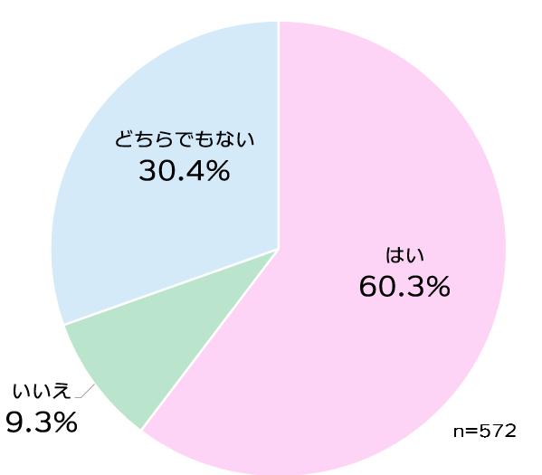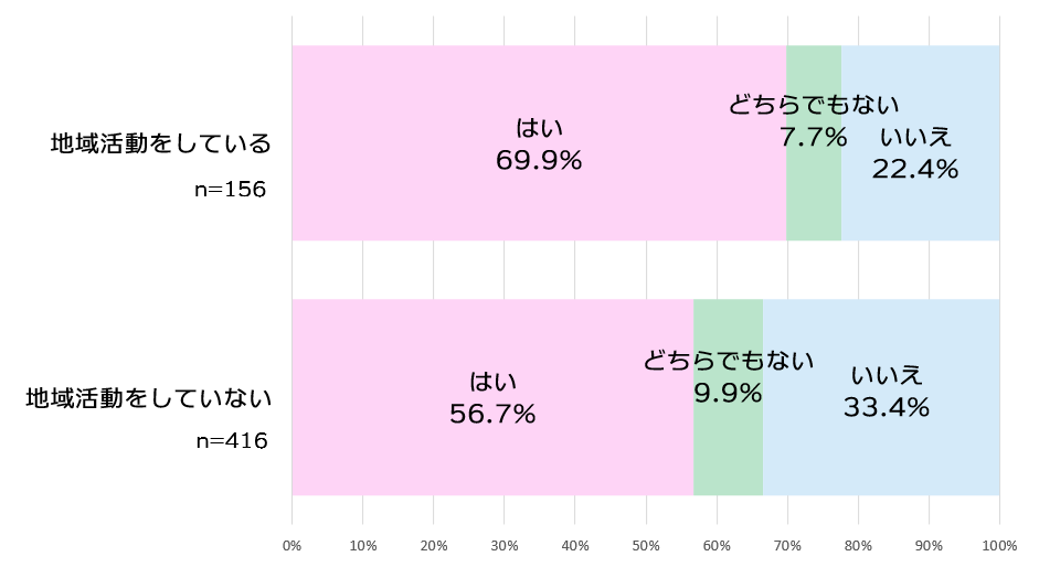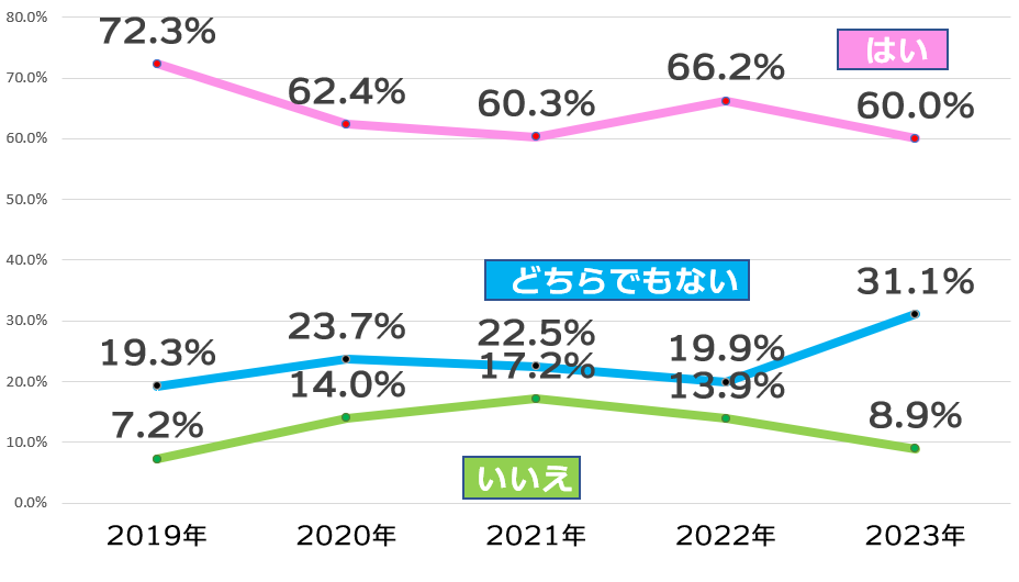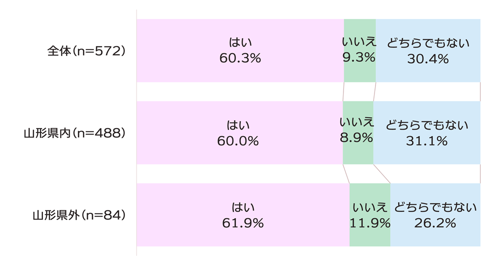 問2の「今住んでいる地域は好きですか」という設問に対しては、「はい」は全体で60.3%となりました。県内在住者のみを経年比較でみると、「はい」は60.0%で昨年の調査より5.3%低い結果となりました。「いいえ」(8.9%)も昨年(14.8%)から5.9%低くなり、「どちらでもない」が31.1%と昨年(19.9%)に比べ大幅に増加したことが特徴的です。