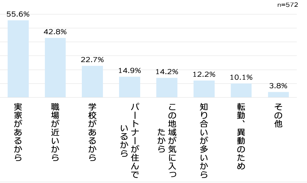 問1の「今の居住地域に住んでいる理由」では、「実家があるから」(55.6%)が最も高く、次いで「職場が近いから」(42.8%)でした。