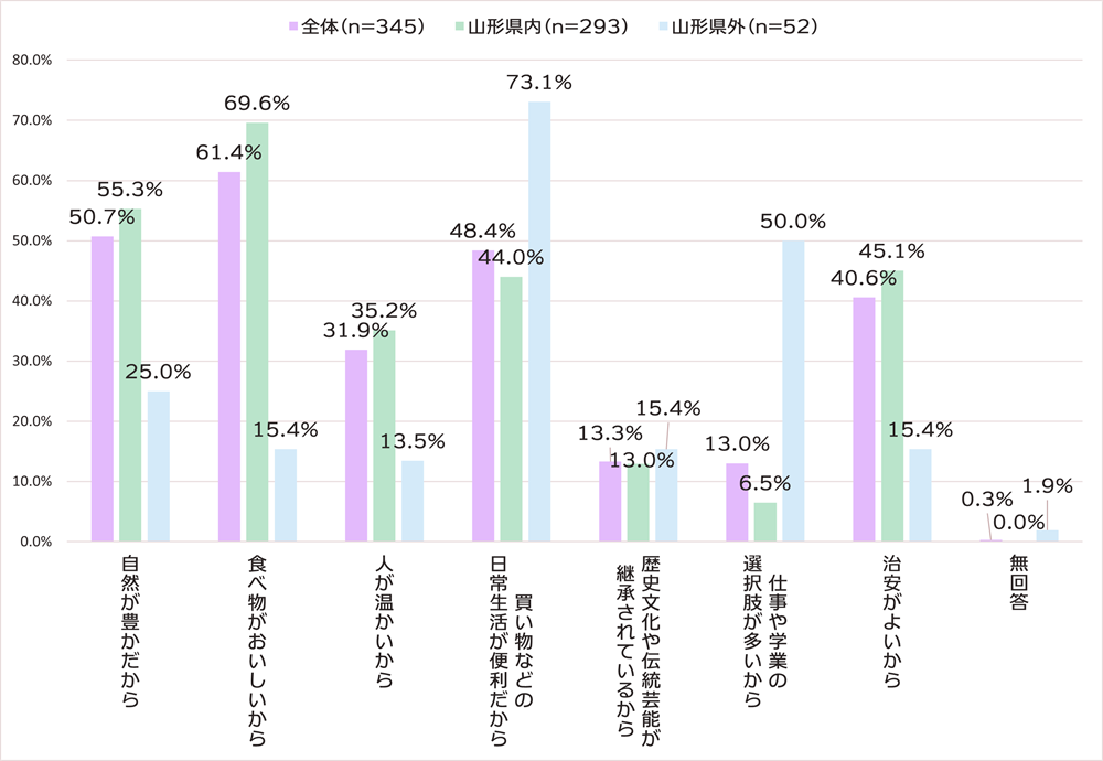 地域が好きな理由(問2-1)は、「食べ物がおいしいから」(61.4%)が最も高く、次いで「自然が豊かだから」(50.7%)という結果となりました。