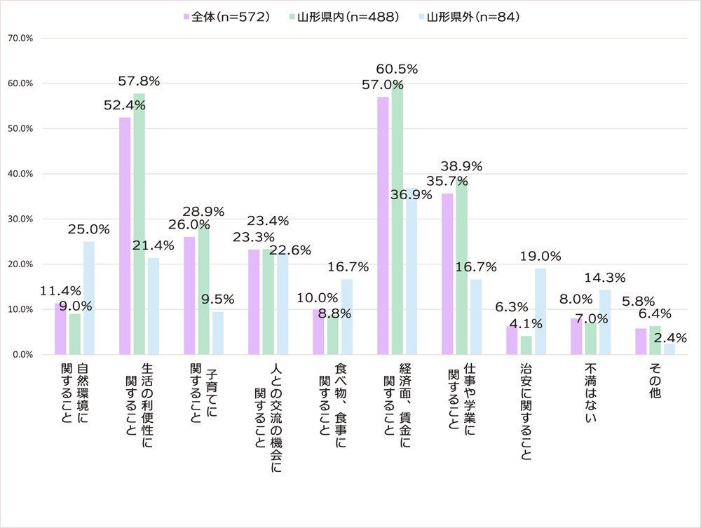 問3の「今住んでいる地域について不満を感じていること」の問いでは、「経済面、賃金に関すること」(57.0%)が最も高く、次いで「生活の利便性に関すること」が52.4%となり、2人に1人が経済面、利便性に関する不満を感じていることがわかりました。