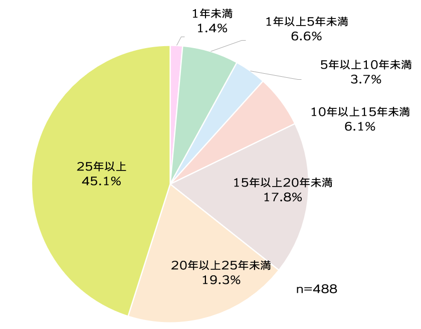 問4で「山形に住んでいる年数」を聞いたところ、最も割合が高かったのは「25年以上」(45.1%)で、次いで「20年以上25年未満」(19.3%)となりました。