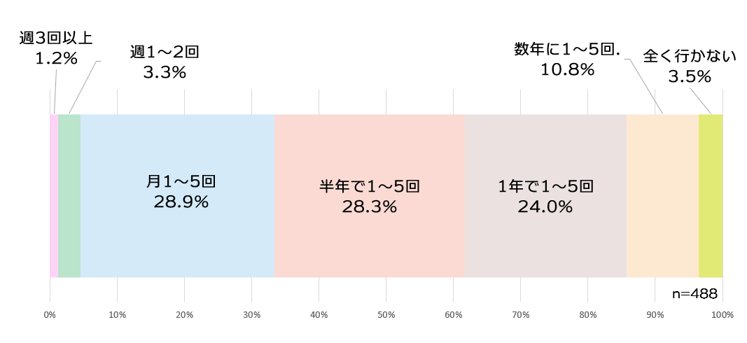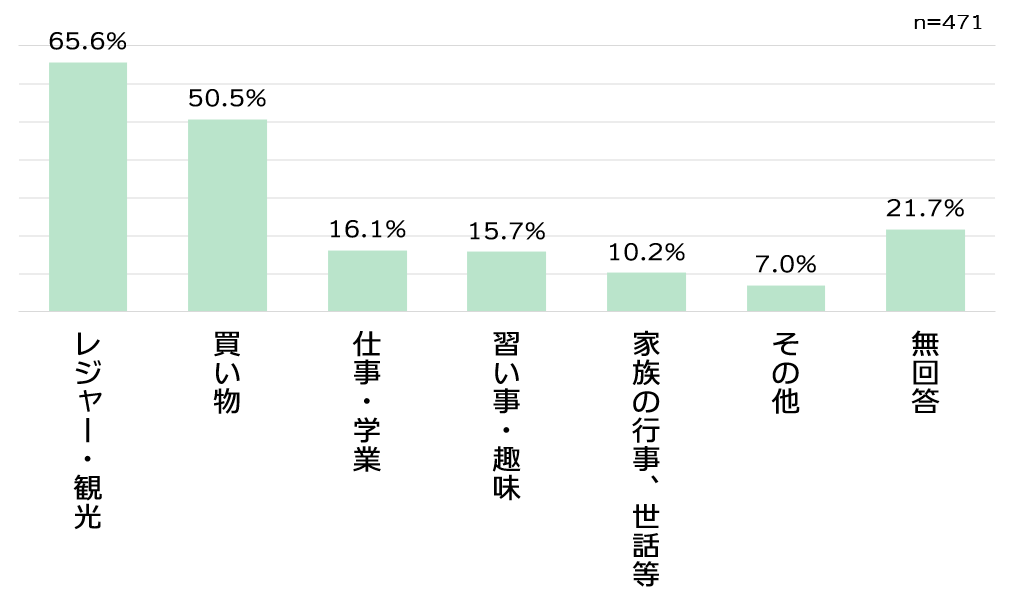 問6では「県外に行く頻度」とその目的(問6-1)をたずねました。県外に行く頻度は「月1~5回」、「半年で1~5回」、「1年で1~5回」がそれぞれ25%前後となり、「全く行かない」と「数年に1~5回」を除き1年に数回以上行くという人は85.7%にのぼりました。その目的としては、「レジャー・観光」(65.6%)が最も高く、次いで「買い物」(50.5%)となりました。