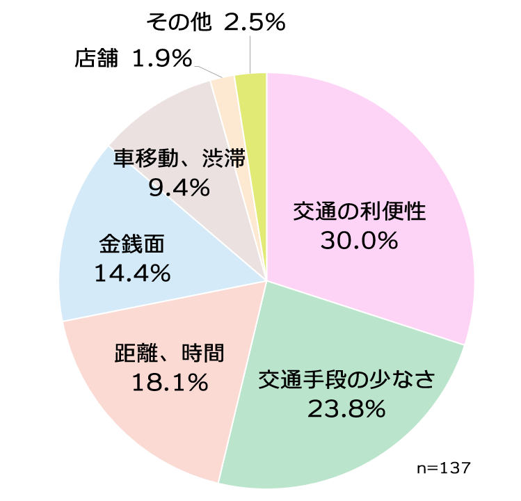 - 都心部への移動時間が長時間であることや、賃金に比べ長距離移動を行う際の費用が高いことで気軽に出かけることができない。