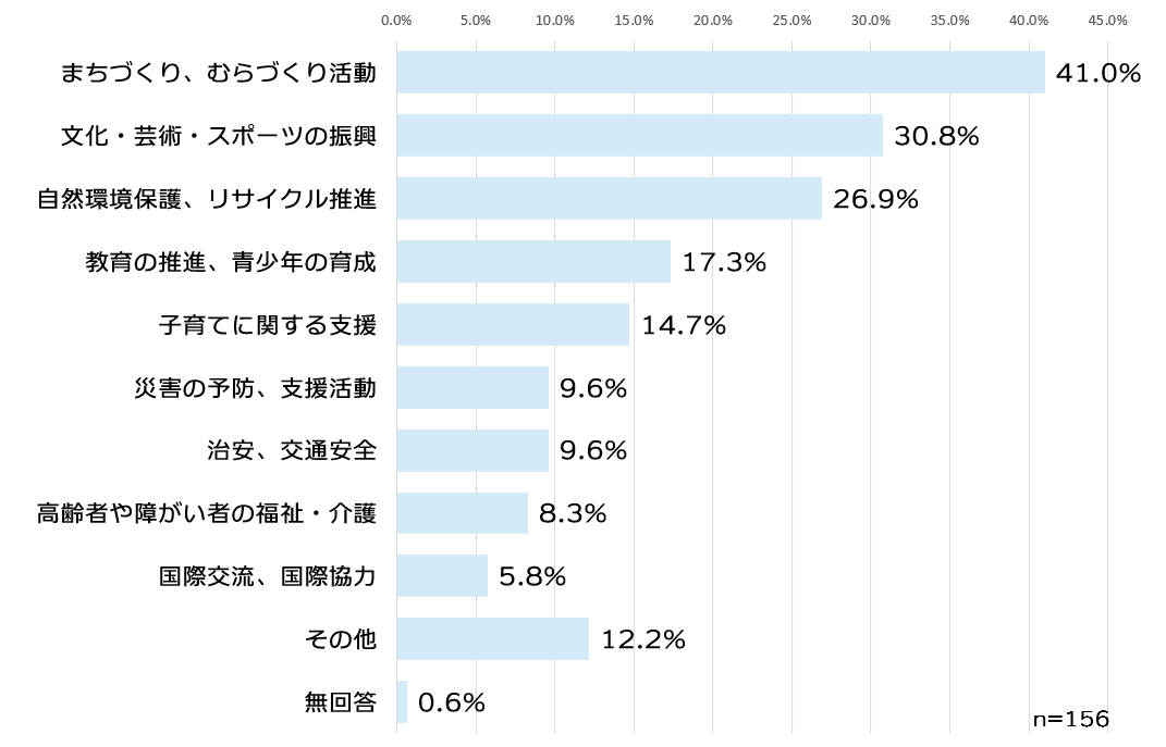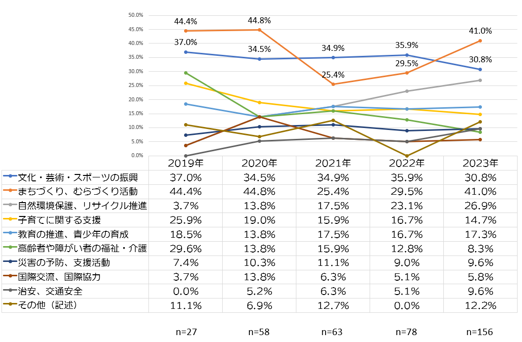 問9-1では、「奉仕的な活動をしている」と回答した人に、どのような活動かをたずねました。その結果、「まちづくり・むらづくり活動」(41.0%)が最も高く、次いで「文化・芸術・スポーツの振興」(30.8%)となりました。2019年からの経年比較では、「まちづくり・むらづくり活動」が全体の割合と同じ経過をたどるようすが確認できるほか、「自然環境保護、リサイクル推進」は2019年から増加を続けていることがわかります。