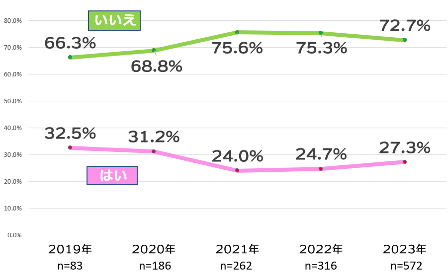 問9では「地域のための奉仕的な活動をしているか」をたずねたところ、「はい」は27.3%となり、4人に1人以上が何らかの形で奉仕的な活動に携わっていることがわかりました。また、2019年からの経年比較では、コロナ禍前(2019年)の32.5%には届かないものの、2021年(24.0%)から徐々に微増しているようすがうかがえました。