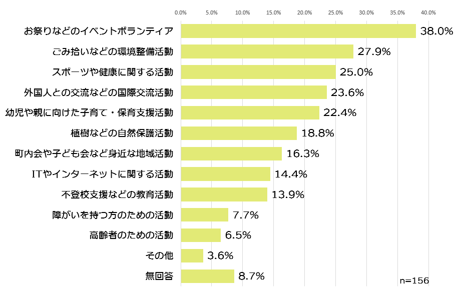 問9-4では、「奉仕的な活動をしていない」と回答した人に、「もしするなら、何をしたいか」をたずねたところ、「お祭りなどのイベントボランティア」(38.0%)、「ごみ拾いなどの環境整備活動」(27.9%)が上位となりました。
