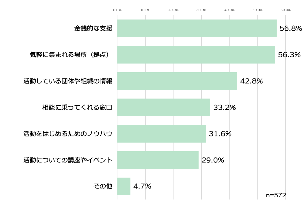 問10では全員に「活動をしたいと思った時に、あったらよいと思うこと」をたずねました。最も割合が高かったのは、「金銭的な支援」(56.8%)で、次いで「気軽に集まれる場所(拠点)」(56.3%)となりました。「その他」と回答した人も4.7%おり、さまざまな声が寄せられました。