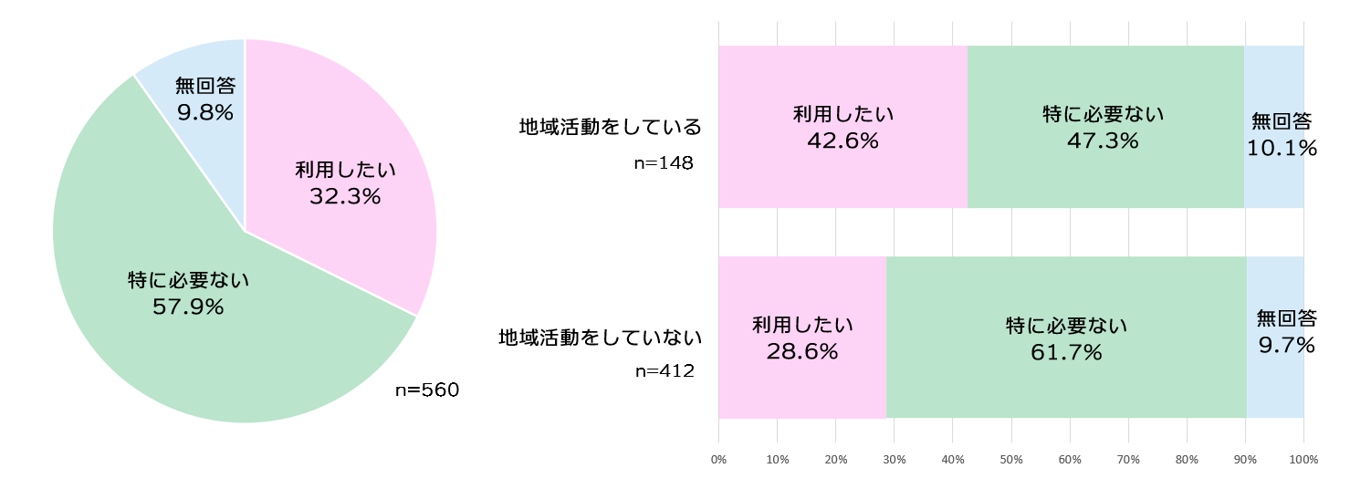 問11-1では、「知らない」、「知っているが利用したことはない」と回答した人に、利用したいと思うかを聞きました。「利用したい」は全体で32.3%となり、前設問で「地域活動をしている」と回答した人でみると42.6%となりました。