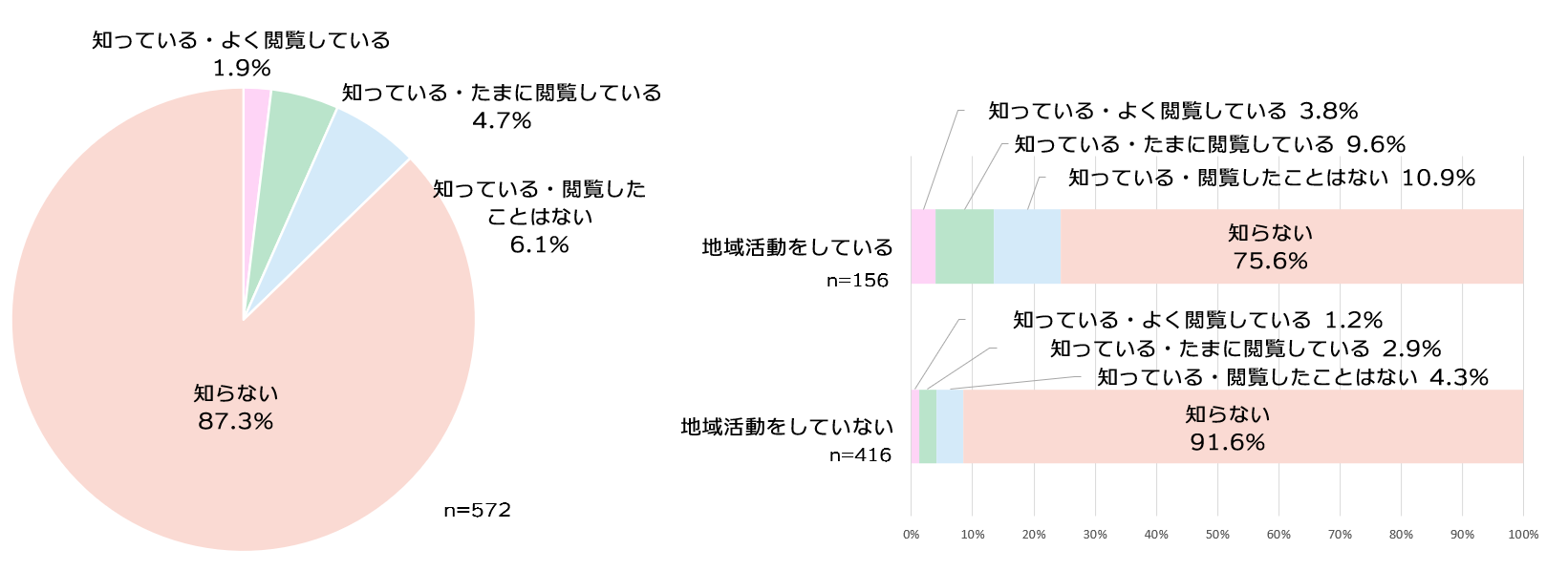 問12では、ウェブサイト「おこしあいネット」の認知度についてたずねました。この設問も「知らない」が87.3%で最も高く、「地域活動をしている」人でも75.6%が「知らない」と回答しました。
