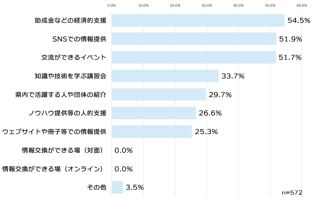 問13では「あるとよい取り組み」についてたずねたところ、「助成金などの経済的支援」(54.5%)が最も高く、「SNSでの情報提供」(51.9%)、「交流ができるイベント」(51.7%)も過半数を超える結果となりました。
