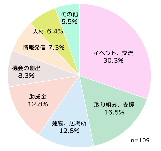 問14では「地域活動が盛り上がるアイディア」を記述式でたずね、103回答を得ました。分類すると「イベント、交流」に関するものが33回答と最も多く、次いで「取り組み、支援」に関するものが18回答となりました。