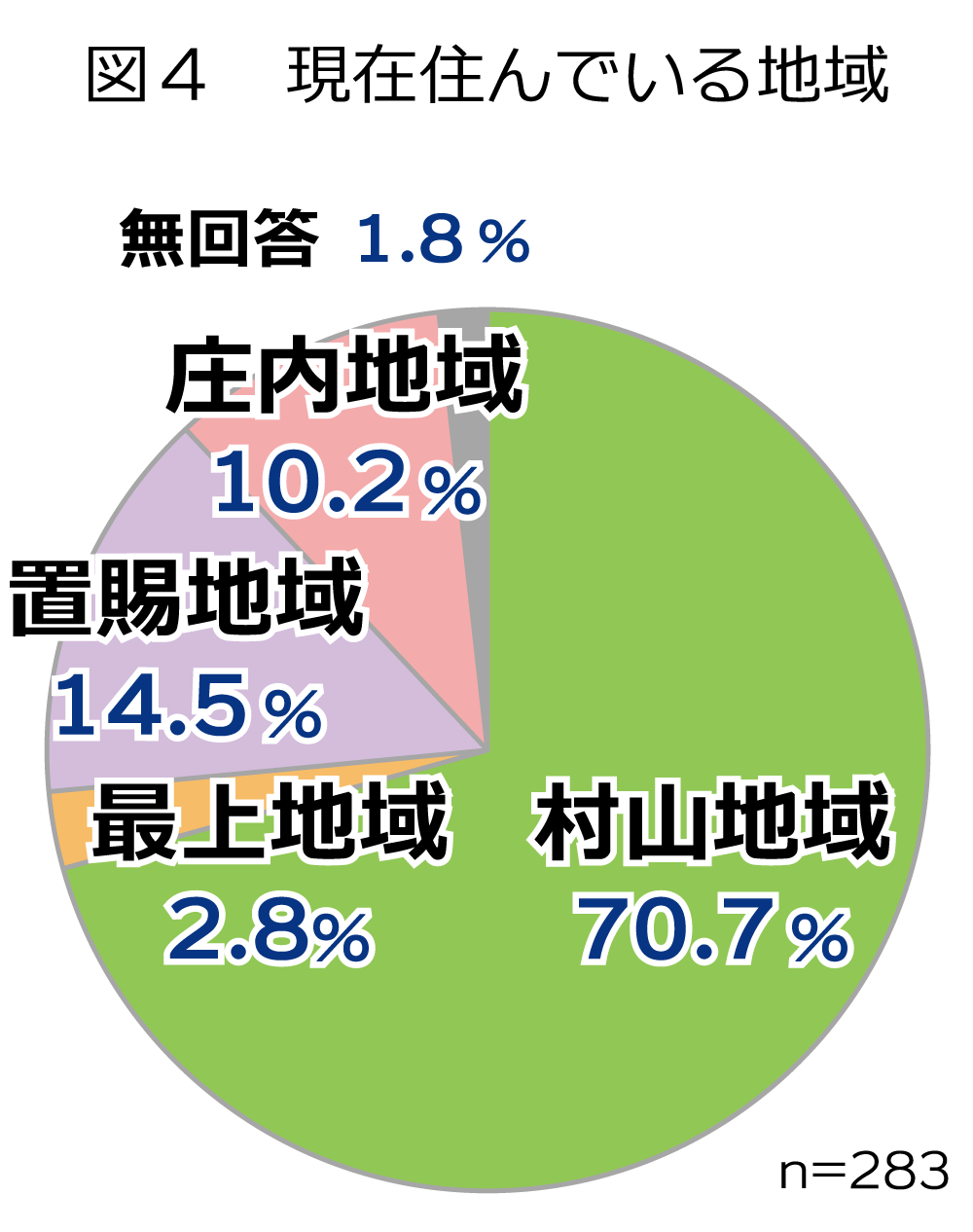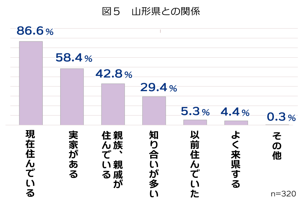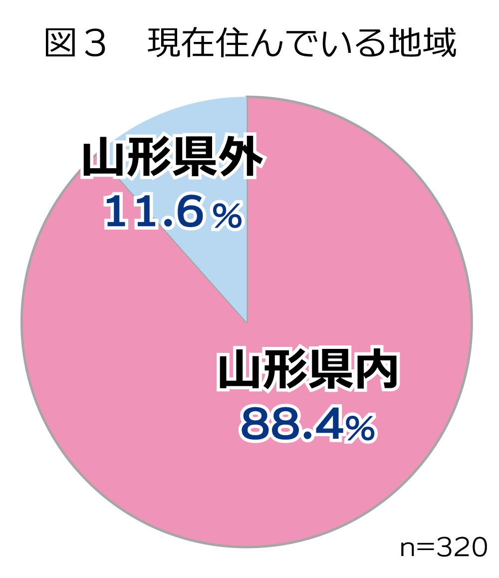 回答者の属性は、女性が62.8%とやや高めで、年代は20代(44.4%)が最も高い結果となりました。居住地域は村山地域が70.7%と過半数を占めています。山形県との関係としては、「現在住んでいる」が88.4%と多数でした。