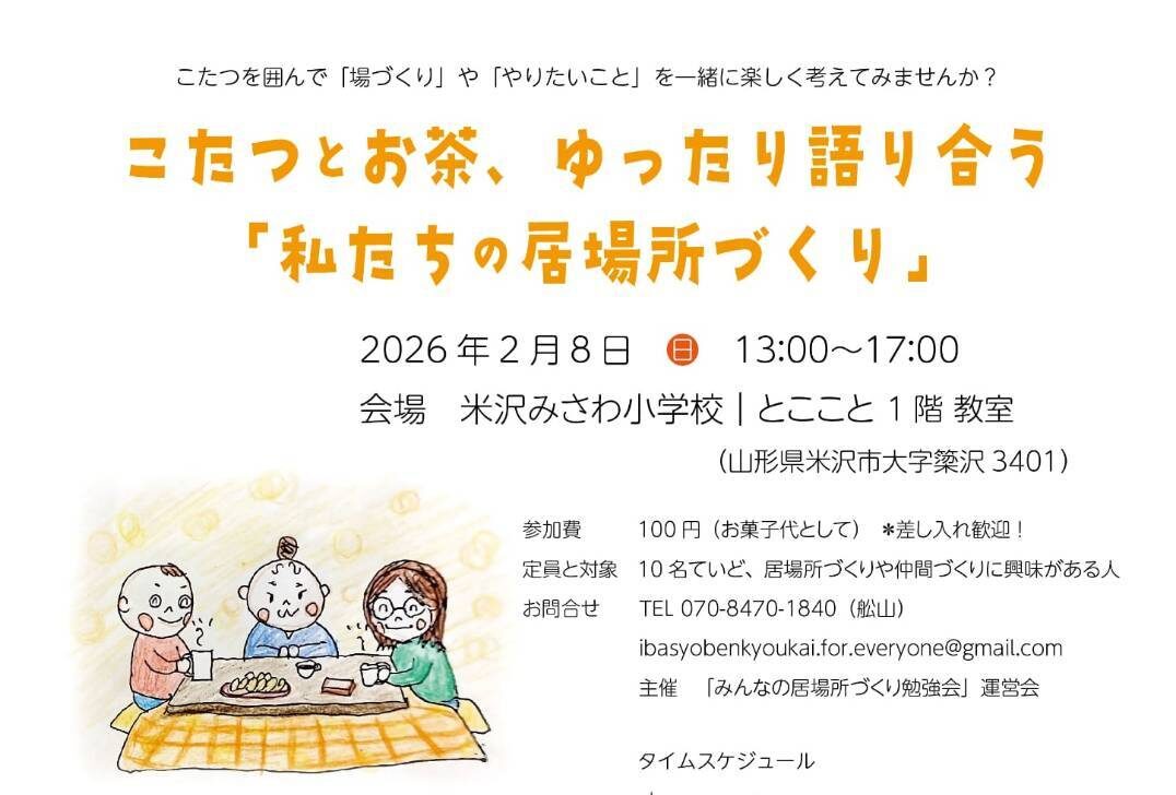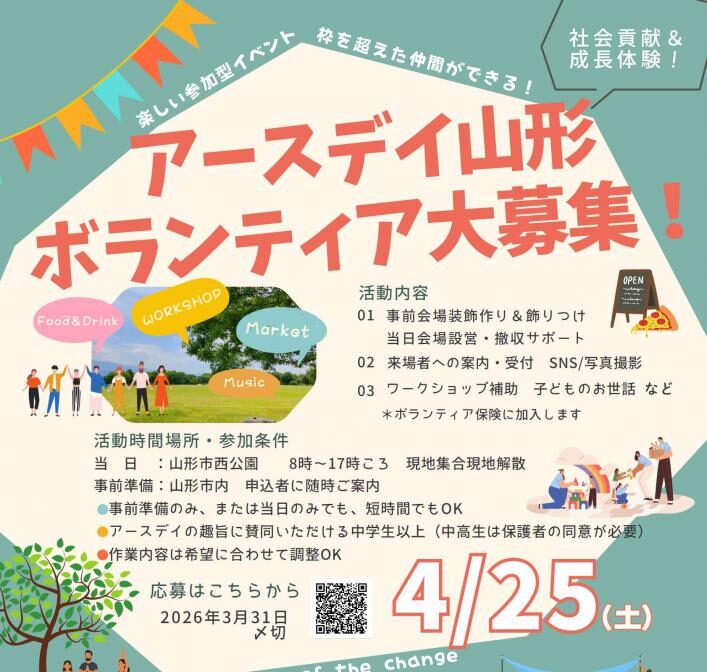 こたつとお茶、ゆったり語り合う「私たちの居場所づくり」2月 8日ありがとうカフェ2月 22日第11回角川雪回廊物語2月 8日Link祭 -winter- 20262月 15日 NEXTEVENT 【若者サポーター】梅津くれ緒さんを登録しました!【若者サポーター】須貝未菜さんを登録しました!【若者サポーター】遠藤和宏さんを登録しました!第4回やまカツ!Meetupを開催しました!【参加者募集】第5回やまカツ!Meetup「地域活動を継続するために押さえておきたい 会計業務と補助金活用」やまがたの若者向け地域活動情報紙 WA-CHA vol.6 が発行されました 若者支援コンシェルジュ アースデイ山形 ボランティア大募集!山形市「花小路」に、みんなの挑戦がはじまる拠点をつくります。寒河江読書会はじまります第49回上杉雪灯篭まつり「ボランティアスタッフ」大募集!(令和8年1月23日(金)締め切り)【クラウドファンディング】昭和レトロな劇場、酒田市港座にエアコンを取り付けて劇場を未来へ残したい(~10/20)【クラウドファンディング】“やままるハロウィン”を開催したい!(9/15まで) 若者プレス 「まちづくりネットワークミーティング」を開催します!やまがた若者応援大使が見つけた!県内で活躍する若者「山形県庁職場見学会2026」を開催します!やまがた若者応援大使が見つけた!県内で活躍する若者【テレビCM放映中!~みんなで気づこうアンコンシャス・バイアス~】クリスマス前に素敵な出会いを✨ 山形県 結果発表 山形いまどき若者アンケート2025地域活動をする仲間を見つけよう!やまカツ!Meetup~地域活動交流会のご紹介~特集「地域を楽しむ、活動でつながる」(2)学生団体おでこBASE特集「地域を楽しむ、活動でつながる」(1)学生団体ConnectWA-CHA vol.6 やまがたの若者向け地域活動情報紙【若者サポーターの活動】日本政策金融公庫山形支店主催「創業応援マルシェ」に協力しました WA-CHA 重要:本サイトのドメインがyama-katsu.jpとなりました EVENT すべて 2月 7日 村山地域 第5回やまカツ!Meetup「地域活動を継続するために押さえておきたい 会計業務と補助金活用」 会場:山形県生涯学習センター遊学館3階 第2研修室 2月 8日 村山地域 あったかじかんマルシェ 会場:天童市市民文化会館 2月 8日 置賜地域 こたつとお茶、ゆったり語り合う「私たちの居場所づくり」 会場:米沢みさわ小学校 とここと 1階 教室 交流 2月 7日 村山地域 第5回やまカツ!Meetup「地域活動を継続するために押さえておきたい 会計業務と補助金活用」 会場:山形県生涯学習センター遊学館3階 第2研修室 2月 8日 置賜地域 こたつとお茶、ゆったり語り合う「私たちの居場所づくり」 会場:米沢みさわ小学校 とここと 1階 教室 2月 13日 オンライン村山地域 まちづくりネットワークミーティング 会場:山形市中央公民館 研修室3 マルシェ 2月 8日 村山地域 あったかじかんマルシェ 会場:天童市市民文化会館 2月 15日 村山地域 Link祭 -winter- 2026 会場:Link MURAYAMA 2月 28日 村山地域 酒宵ノ市 会場:やまがたクリエイティブシティセンターQ1(旧第一小学校) 学習・研修 2月 7日 村山地域 第5回やまカツ!Meetup「地域活動を継続するために押さえておきたい 会計業務と補助金活用」 会場:山形県生涯学習センター遊学館3階 第2研修室 展示・発表 2月 8日 最上地域 第11回角川雪回廊物語 会場:戸沢村南部地区地域振興センター(旧角川小中学校) 2月 13日 オンライン村山地域 まちづくりネットワークミーティング 会場:山形市中央公民館 研修室3 3月 1日 村山地域 Mura6 2026 会場:甑葉プラザ その他 2月 15日 村山地域 Link祭 -winter- 2026 会場:Link MURAYAMA 2月 23日 村山地域 防災体験フェスタ 会場:山辺町中央公民館と駐車場 イベント一覧 NEWS ニュース一覧 若者プレス 2026/01/27 アースデイ山形 ボランティア大募集! 山形県からのお知らせ 2026/01/20 「まちづくりネットワークミーティング」を開催します! 若者支援コンシェルジュ 2026/01/15 【若者サポーター】梅津くれ緒さんを登録しました! 山形県からのお知らせ 2026/01/13 やまがた若者応援大使が見つけた!県内で活躍する若者 若者支援コンシェルジュ 2026/01/06 【若者サポーター】須貝未菜さんを登録しました! 若者支援コンシェルジュ 2026/01/06 【若者サポーター】遠藤和宏さんを登録しました! 山形市「花小路」に、みんなの挑戦がはじまる拠点をつくります。 若者プレス 「山形県庁職場見学会2026」を開催します! 山形県からのお知らせ 第4回やまカツ!Meetupを開催しました! 若者支援コンシェルジュ 【参加者募集】第5回やまカツ!Meetup「地域活動を継続するた... 若者支援コンシェルジュ 寒河江読書会はじまります 若者プレス やまがたの若者向け地域活動情報紙 WA-CHA vol.6 が発... 若者支援コンシェルジュ やまがた若者応援大使が見つけた!県内で活躍する若者 山形県からのお知らせ 第49回上杉雪灯篭まつり「ボランティアスタッフ」大募集!(令和8... 若者プレス 【テレビCM放映中!~みんなで気づこうアンコンシャス・バイアス~】 山形県からのお知らせ 【参加者募集】「法人化実践者に聞く! 活動の育て方・広げ方」第4...