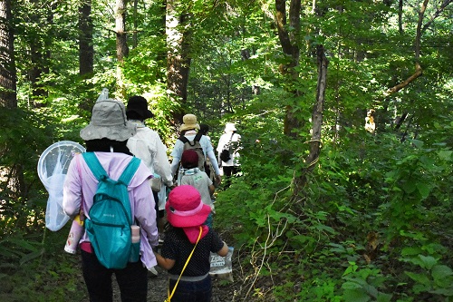 参加するのは、12組の家族、20人の子どもたち。虫取り網をしっかり握りしめて、でこぼこの道をお父さんお母さんと手をつないで歩きます。