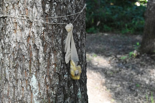 作った餌をストッキングの中に入れ、口をぎゅっと縛ります。それを麻ひもなどで木に括り付ければ、完成です!虫が大好きな臭いは人にはちょっときついので、割りばしを使って作業します。