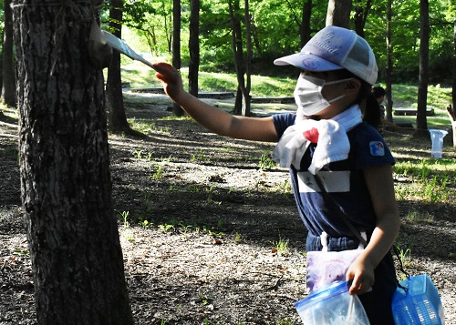 最後に、虫の好きな臭いが凝縮された液を、はけで木に塗り付けます。こうすることで、もっと虫が寄ってきやすくなります。
