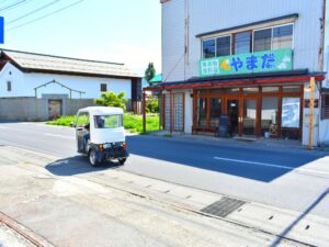 カレーを買いに来たお仲間の三輪バイクに試乗する山田さん