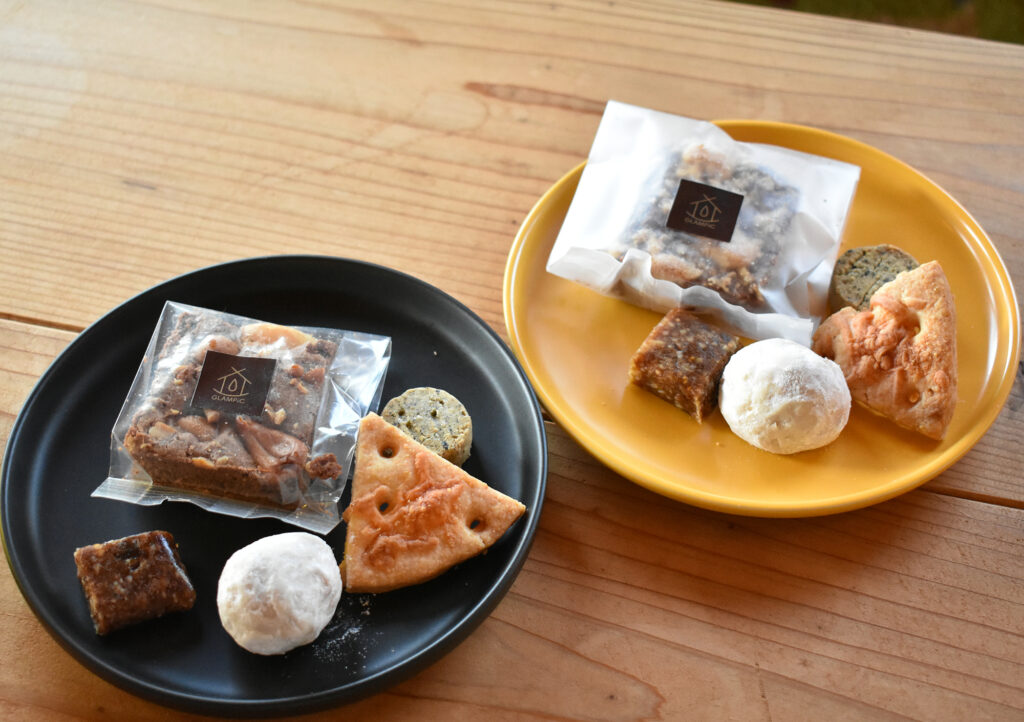 △GLAMPiCで販売するお菓子と宮城さんがパッケージデザインをしたプロテインバー