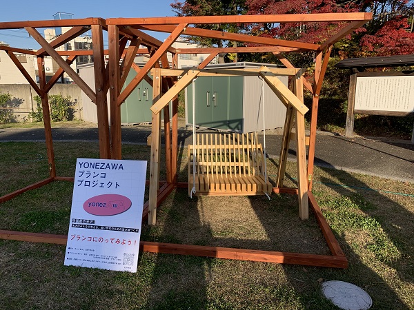 こちらは「街なかで乗れるブランコを造りたい」と東北芸術工科大学の学生さんが企画を持ち込み、山形大学の建築デザイン専攻の学生さんに設計、製作してもらいなんと2週間で完成させたとのこと。