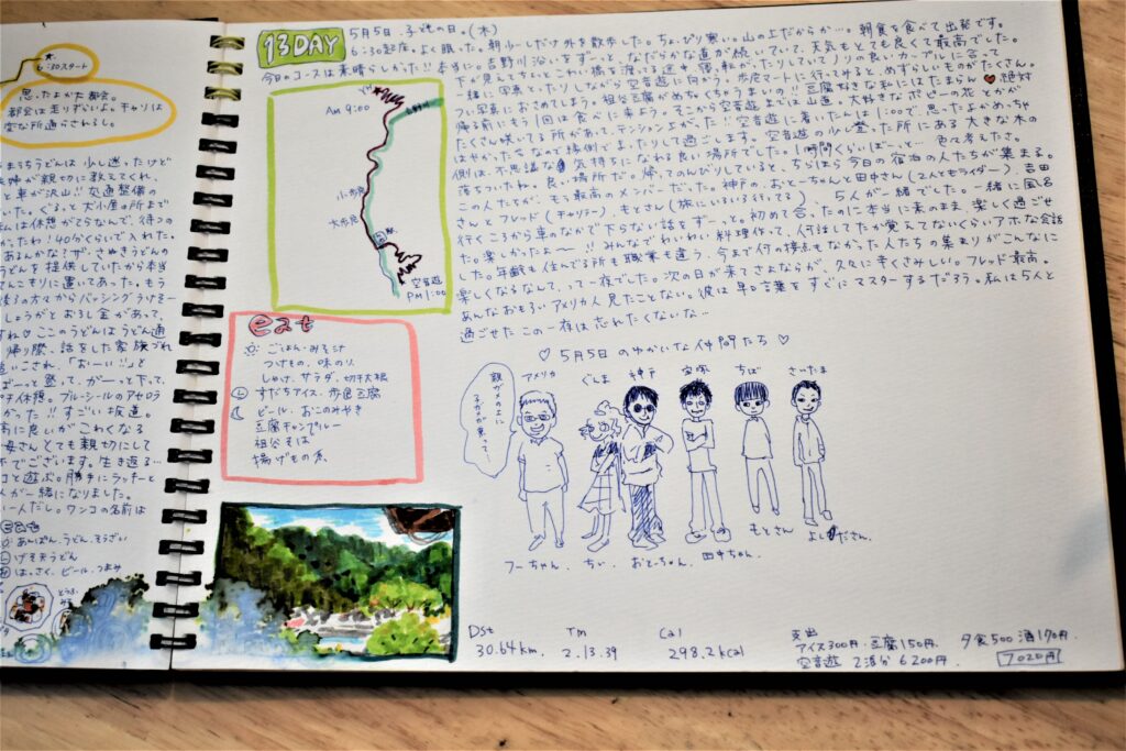 その食事の内容や出来事が絵日記にしてあり、「(夫の)フレッドと出会った日はここですね」と示してくれたページを恐縮しながら拝見すると、徳島の山中のゲストハウスでの出会いが書かれていました。