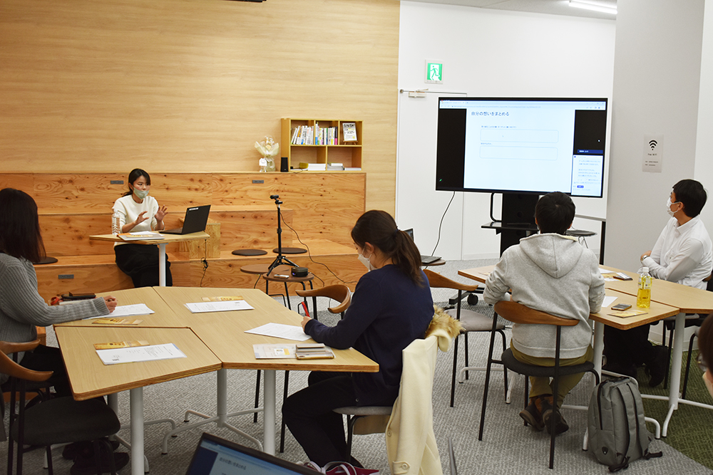会場のスタートアップステーション・ジョージ山形には4名の参加者が集まり、オンラインの参加者と共に、地域活動や起業をするにあたって重要となる「伝え方」について、「ヤマガタ未来ラボ」を運営する田中麻衣子さんに伺いました。
