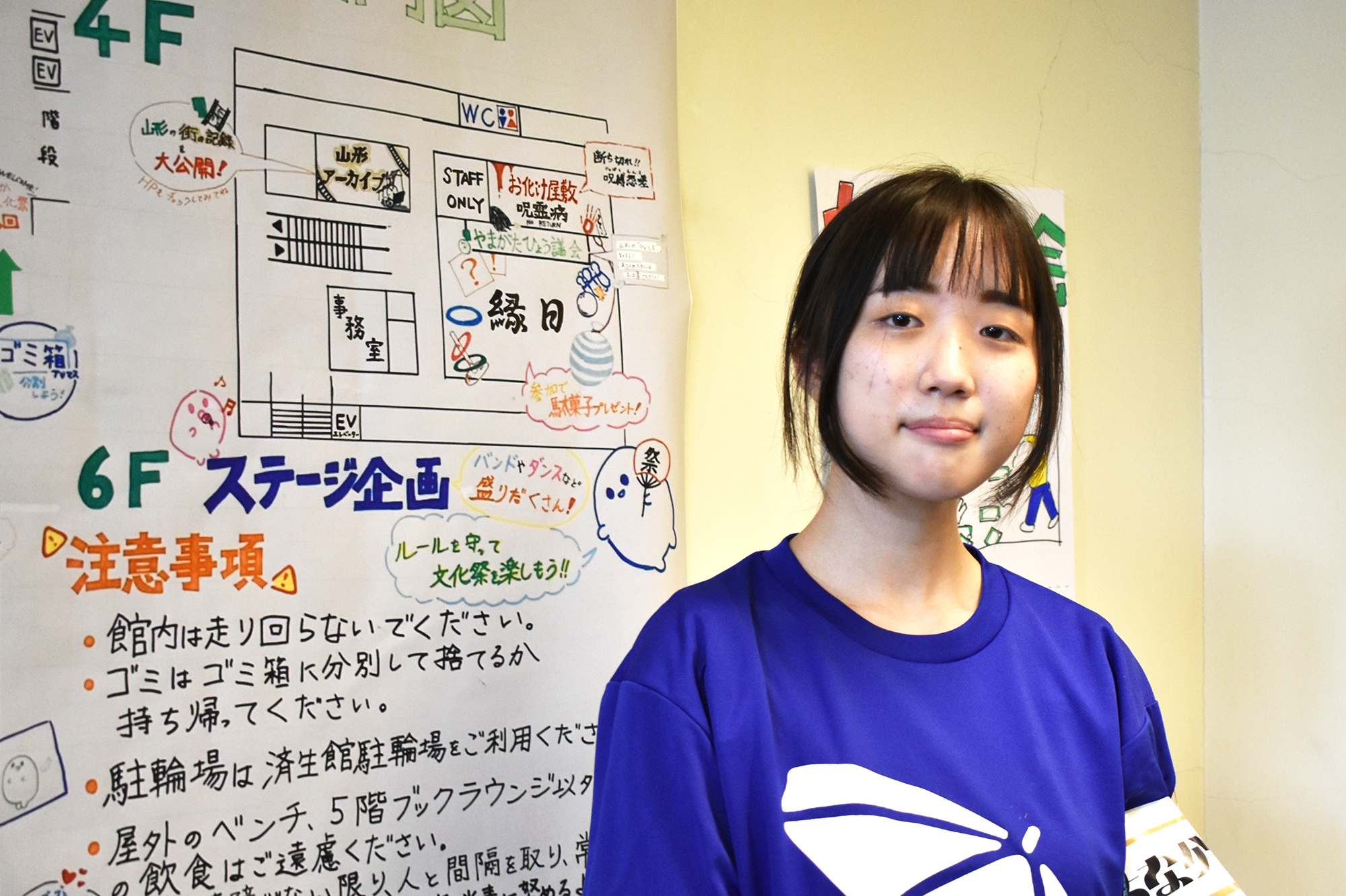 「今回の文化祭のような企画をしたいという思いは、2年生の時からありました。探究活動では私たち東高校と中央高校が一緒に行っていて、そうして他校生と関わることで自分の中でいい刺激になり、考えをまとめるきっかけにもなりました。同じように他校生と関わることで他の高校生にもこの感覚を得てほしいと企画したのですが、その時点では人を集める手段が足りず、3年生まで持ち越して、4月に山形市の『まちなかサードプレイス事業』を通じて仲間を募りました」