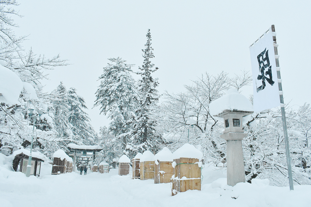 「上杉雪灯篭まつり」は、豪雪を利用して松が岬公園一帯を主会場に約200基の雪灯篭と1,000個の雪ぼんぼり(雪洞)が灯る米沢市の冬の一大イベントです。