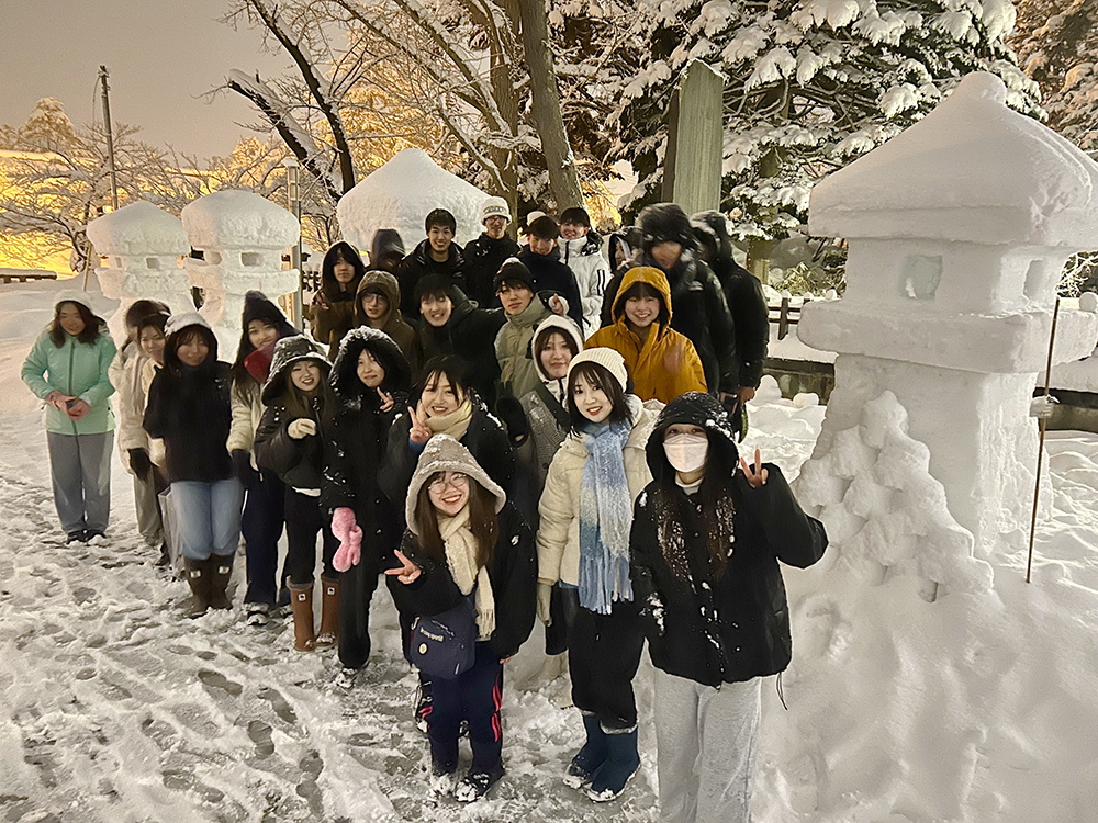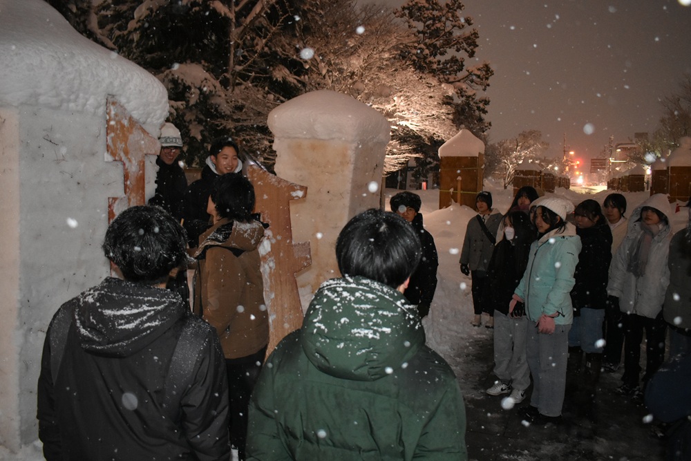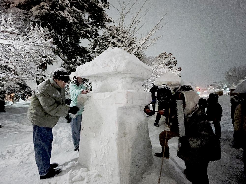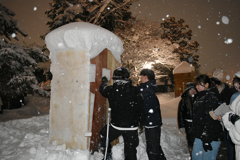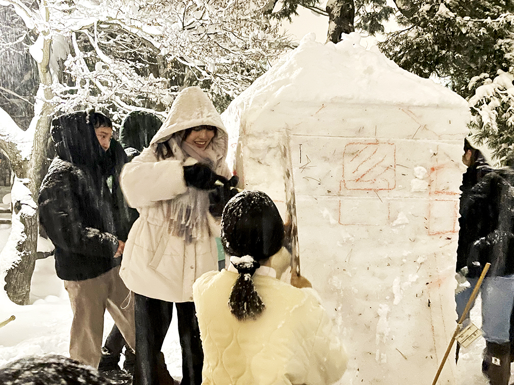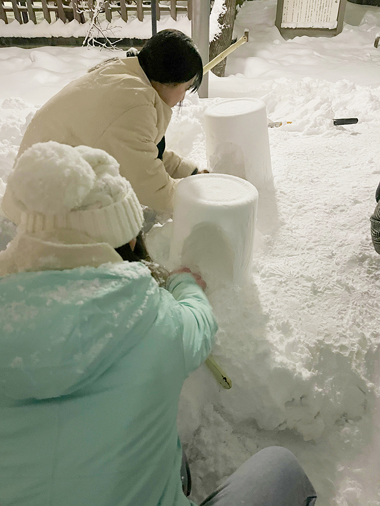 早稲田大学の学生のみなさんと一緒に雪灯篭づくり