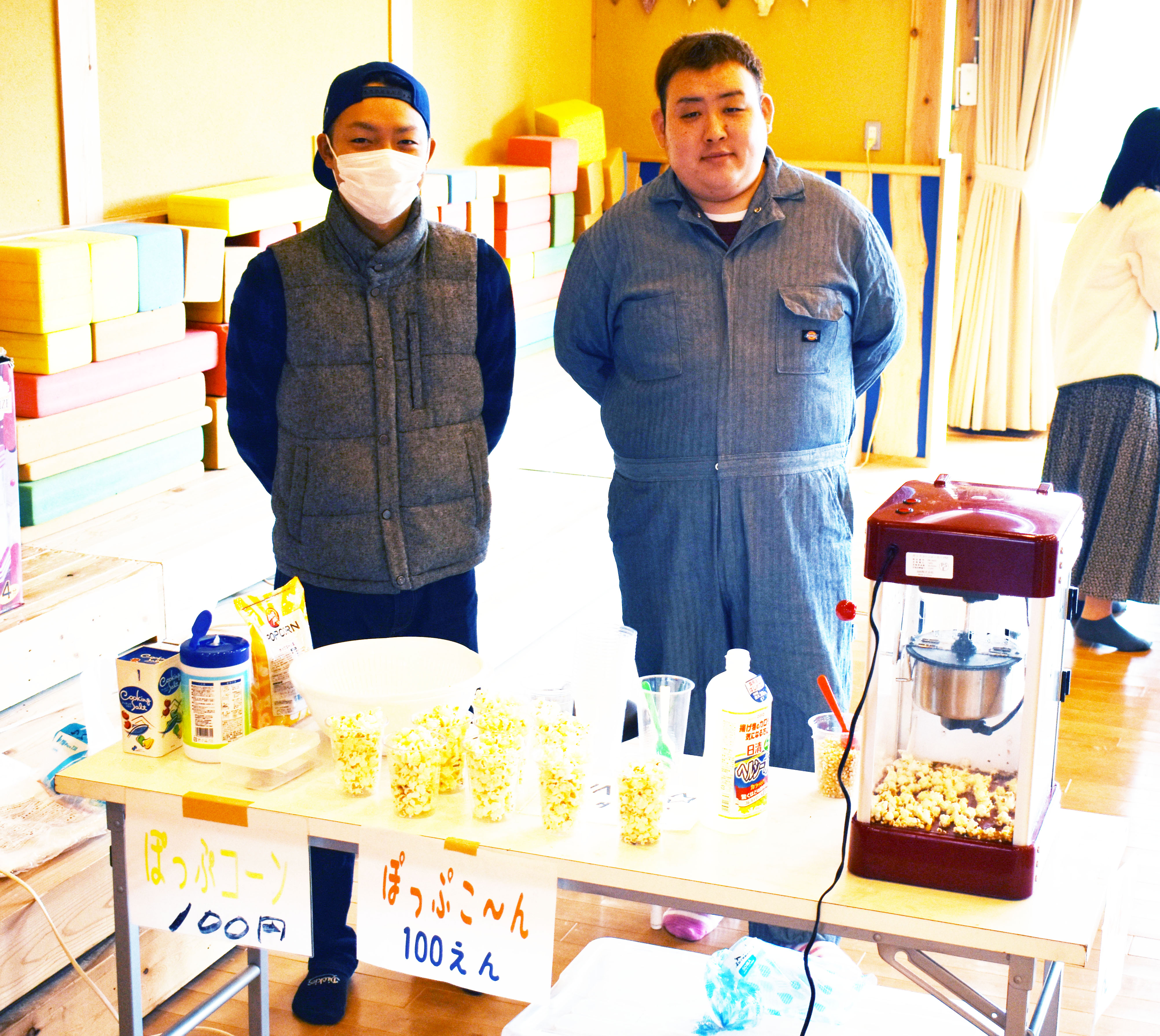 木造で窓が大きく、温かみのあるこども園の中は、食べ物や体験、縁日屋台などのブースが並んでいました。