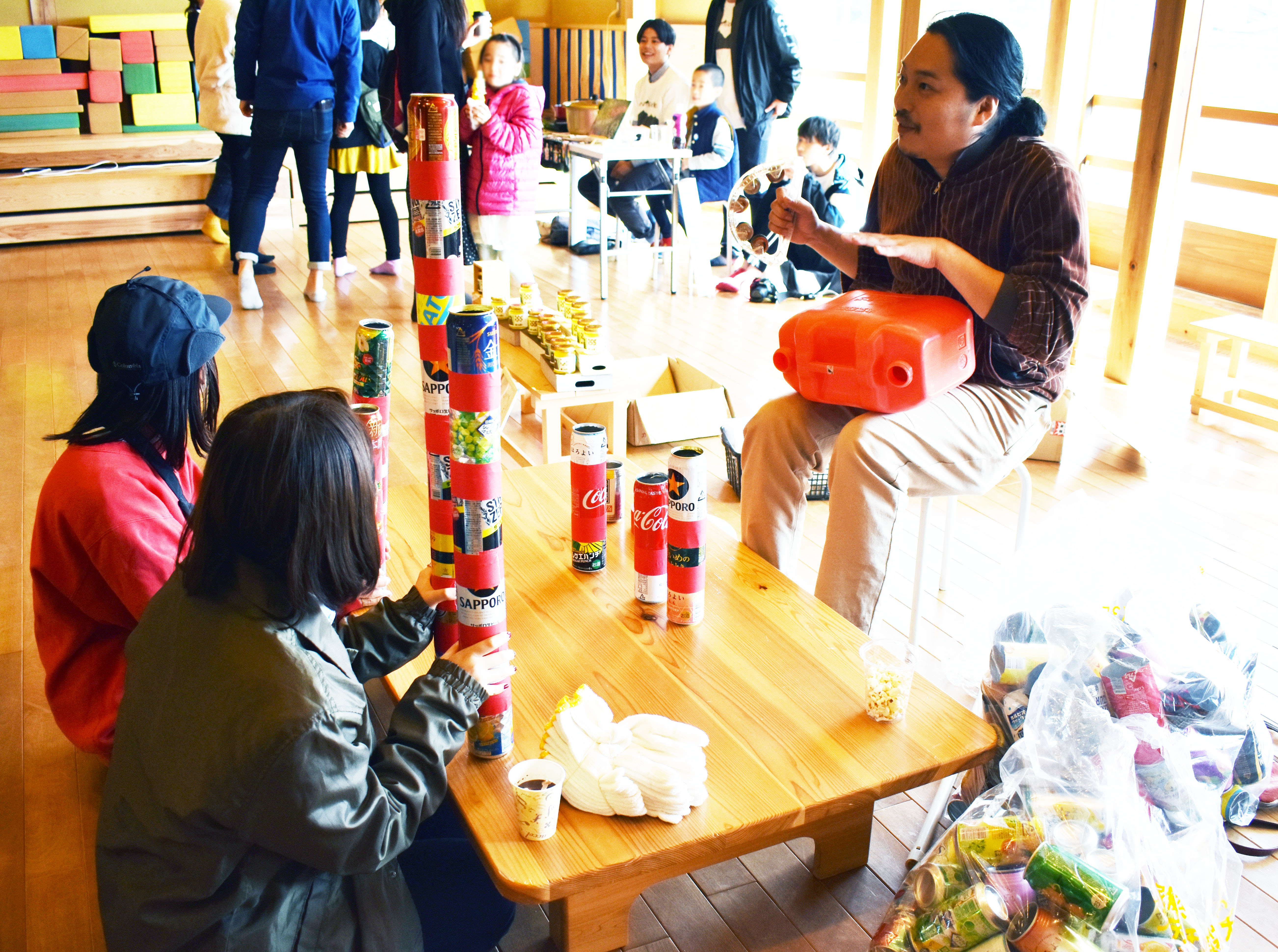 そこではポップコーンやホットココア、それから空き缶をつなげて楽器にしたものでリズムを奏でる体験を行っていました。