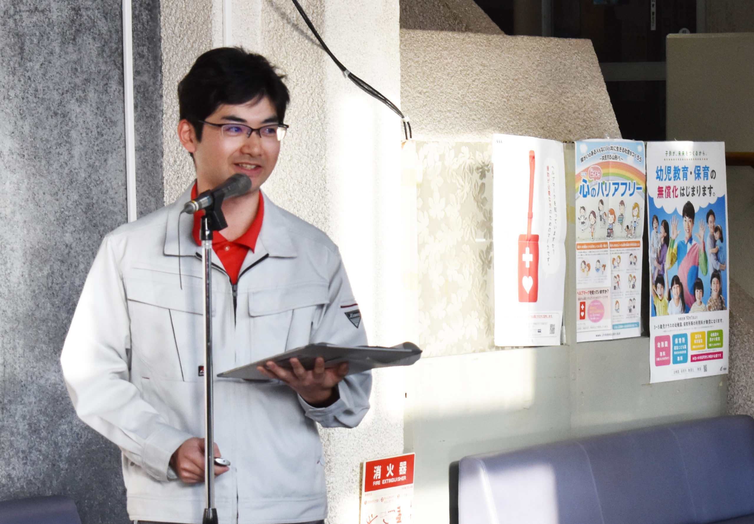 日の差し込む中、河北町役場の1階ロビーで報告会が行われました。
