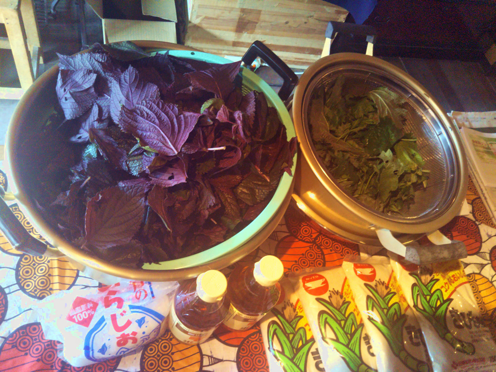 本日の材料。赤紫蘇、青紫蘇、塩、きび砂糖、酢!