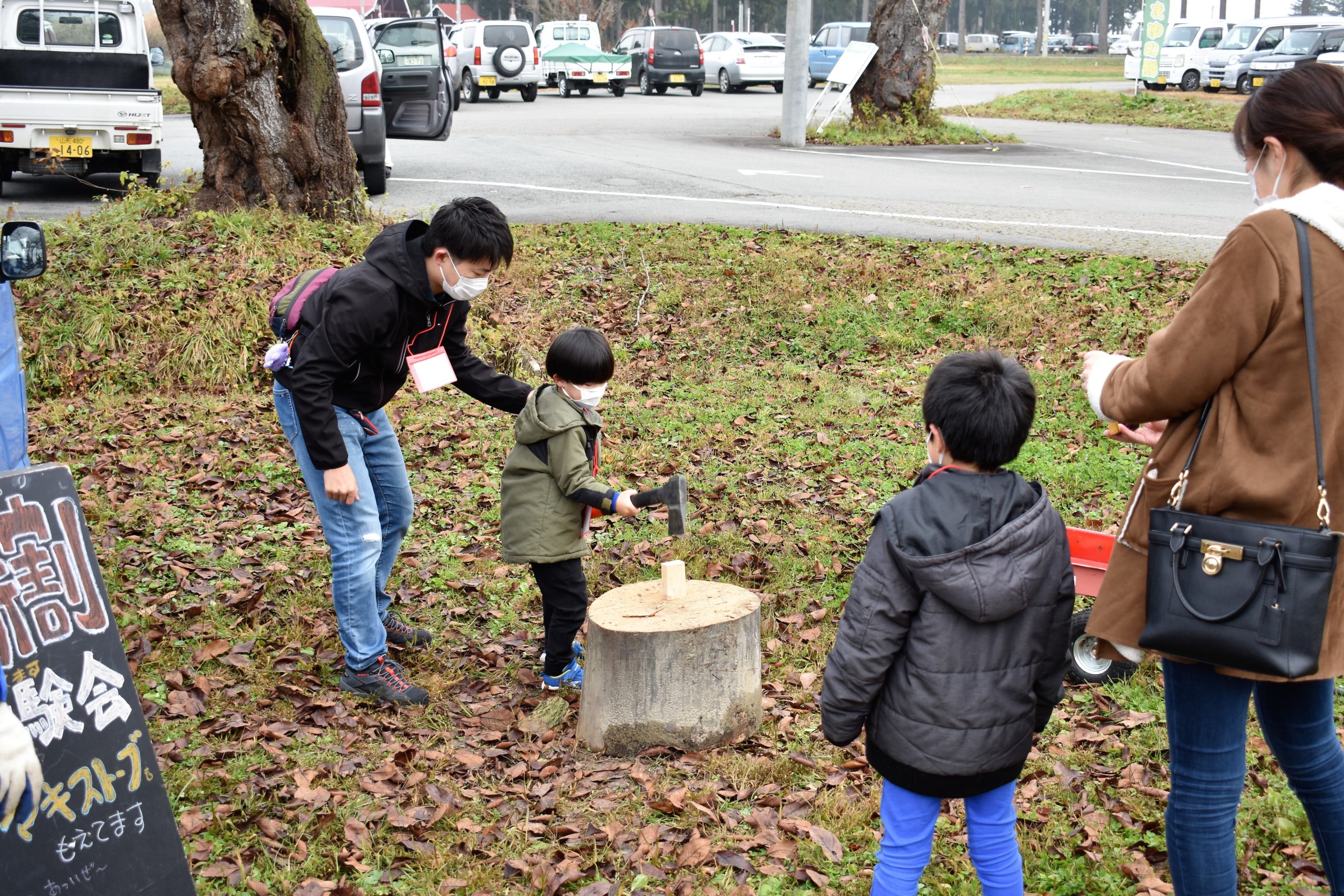 薪割りを体験する親子、
