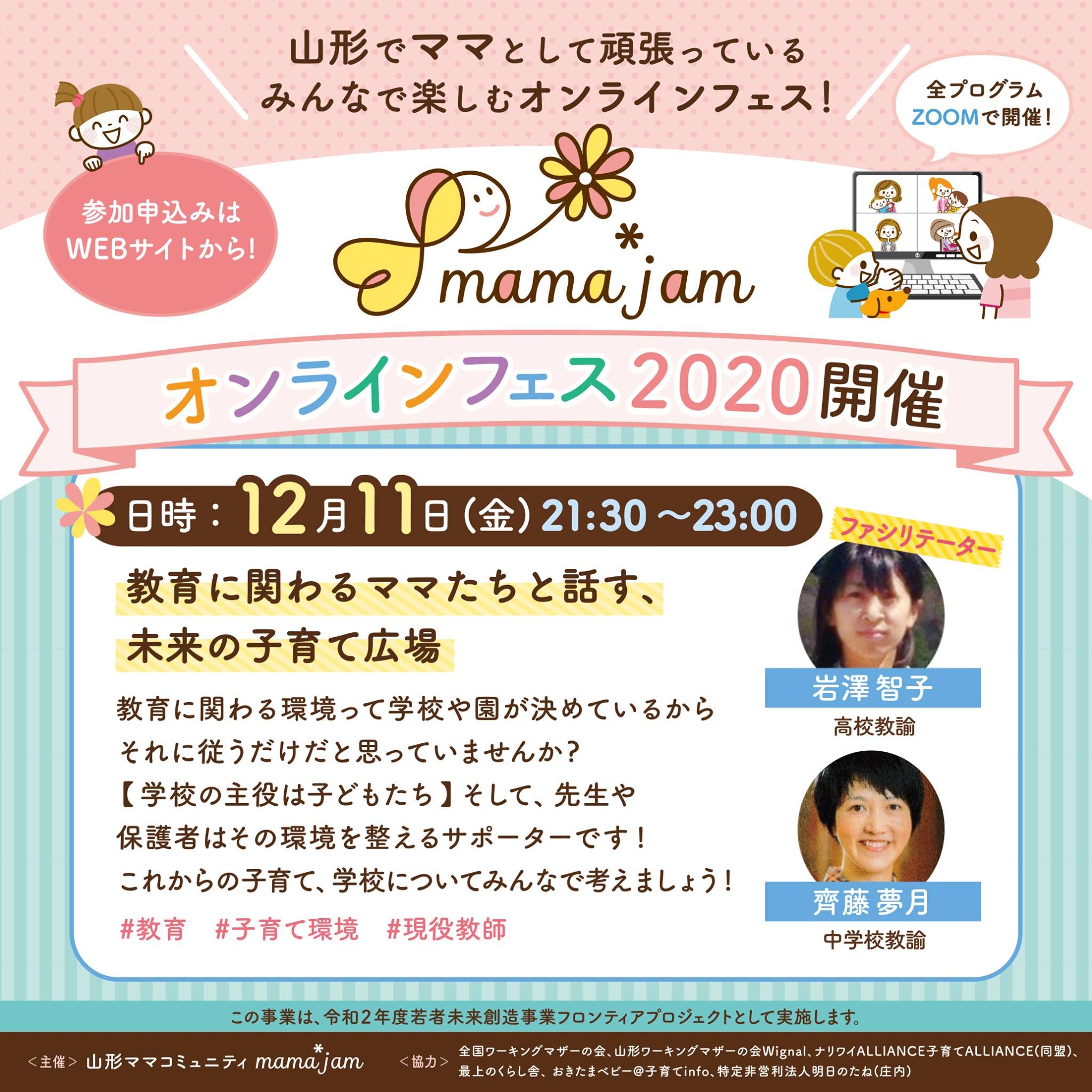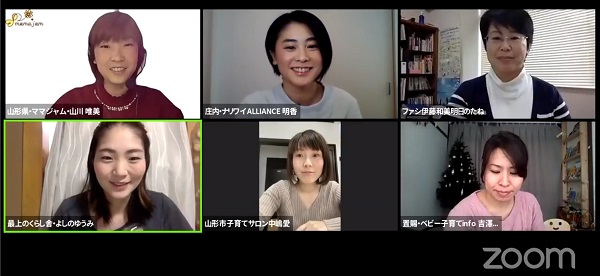 11月28日に開催された第3回目のオンラインフェスでは、「県内4エリアコミュニティ運営ママが語る、未来のやまがた」と題して、県内4地域で活躍するママたちが一同に会し、Zoomでその想いを語り合いました。