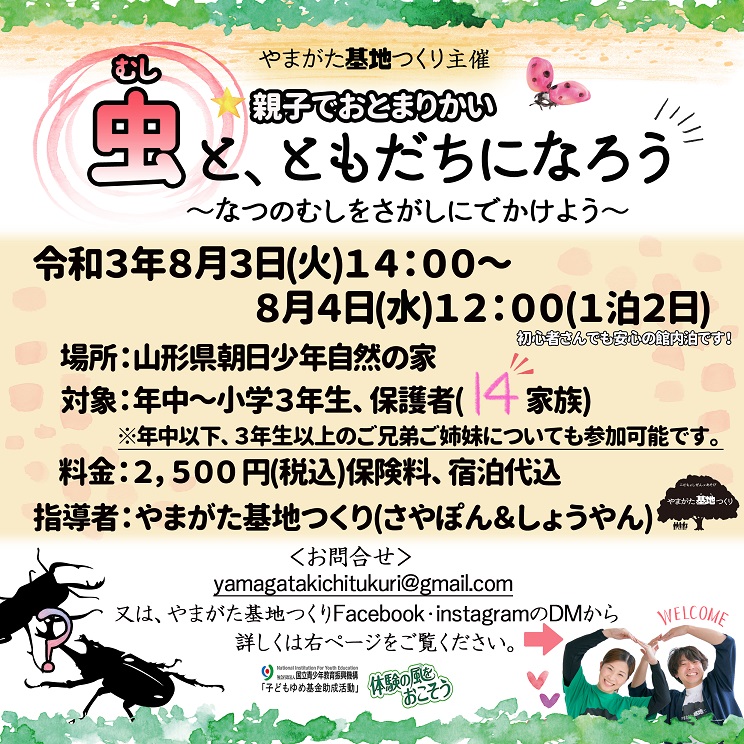 添付ファイル | R3.8.3親子でお泊まり会 虫とともだちになろう実施要項 |