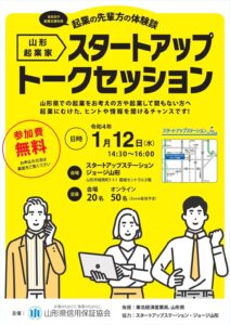 山形県での起業をお考えの方や起業して間もない方、起業に向けたヒントや最新施策等の情報を聞けるチャンスです。是非ご参加ください。