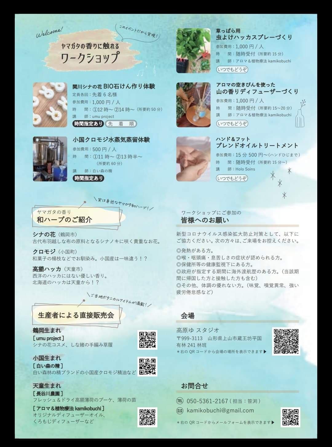 自然とアクティビティを満喫できる山形蔵王坊平にある「高源ゆ」にて、やまがたの香りに触れる体験型ワークショップや、生産者によるハーブやアロマの直接販売会を行います。