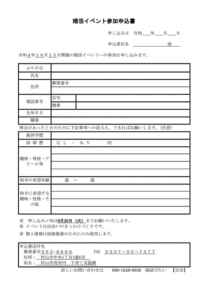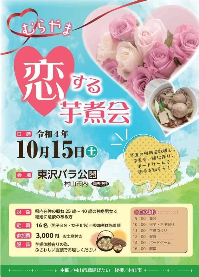2022年 10月 15日(土曜日) 9:00~ むらやま恋する芋煮会 会場:東沢バラ公園 芋煮の材料を収穫し、芋煮を一緒に作り、ボードゲームで相手を知ろう! ※男性は定員になりました。女性参加者を募集しております。 添付ファイル むらやま恋する芋煮会参加申込書 連絡先 村山市縁結びたい 記事番号:16146