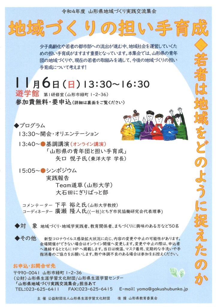 少子高齢化や若者の都市部への流出が進む中、地域社会を運営していくための担い手育成がますます重要となっています。本集会では、山形県の青年団の地域づくりや、現在の若者の取組みを通して、今後の地域づくりの担い手育成について考えます!