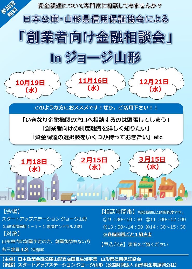 日本政策金融公庫・山形県信用保証協会が共催する、参加費無料の金融相談会を開催いたします。