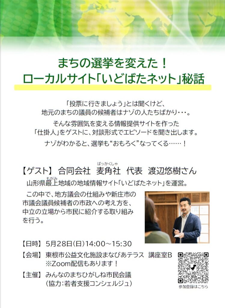 山形県最上(もがみ)地域の地域情報サイト「いどばたネット」を運営。この中で、地方議会の仕組みや新庄市の市議会議員候補者の市政への考え方を、中立的な立場から市民に紹介する取り組みを行う。