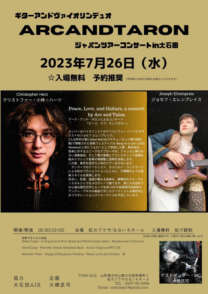 内容 | 大石田AIR 企画 ヴァイオリンギターデュオARC and TALON ジャパンツアー大石田公演 「ピース、ラブ、そしてギター」 |