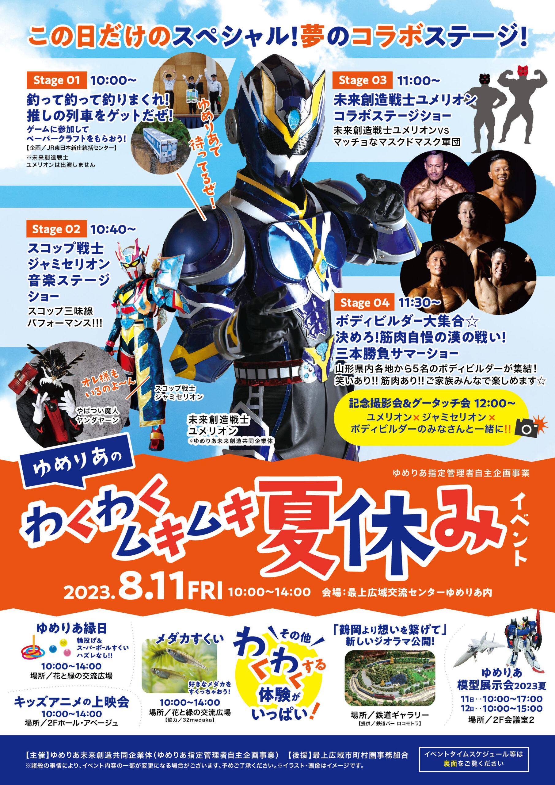 内 容:ボディビルダー大集合!「未来創造戦士ユメリオン」とコラボしたステージショーを開催。そのほか、子供たちに大人気の縁日やメダカすくいなど!夏はゆめりあでわくわくな体験をしよう!