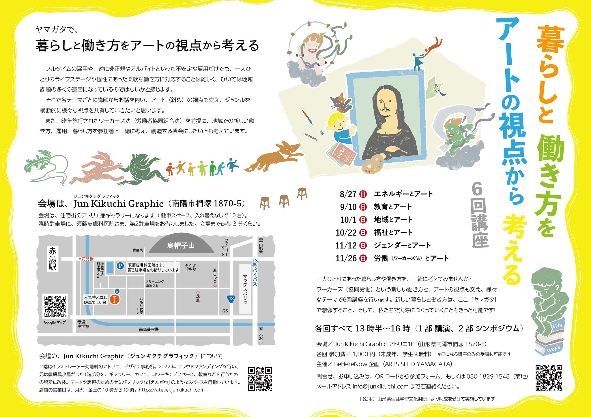 ワーカーズ(協同労働)という新しい働き方と、アートの視点も交え、様々なテーマで6回講座を行います。新しい暮らしと働き方は、ここ「ヤマガタ」で想像すること、そして、私たちで実際につくっていくこともきっと可能です!