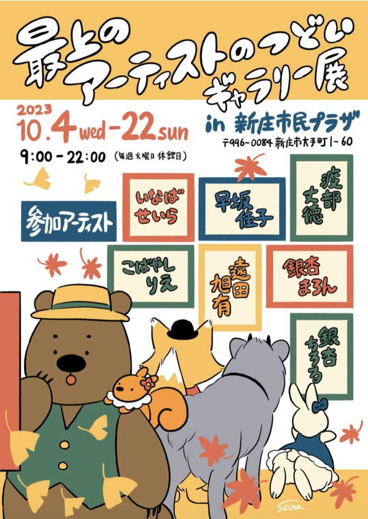2023年 10月 4日(水曜日) 9:00~ 最上のアーティストのつどい ギャラリー展 会場:新庄市民プラザ (山形県新庄市大手町1-60) 最上のアーティストのつどい ギャラリー展 日時:2023年10月4日(水)~22日(日) 9:00~22:00(毎週火曜日休館日) 場所:新庄市民プラザ (〒996-0084 山形県新庄市大手町1-60) 参加アーティスト(五十音順・敬称略) いなばせいら(Facebook) 遠田旭有 (Facebook) 銀杏ちろる 銀杏まろん (Instagram) こばやしりえ(Facebook) 早坂佳子 (Facebook) 渡部丈徳 (Facebook) 関連URL https://www.facebook.com/groups/838365546635786/ 記事番号:19981